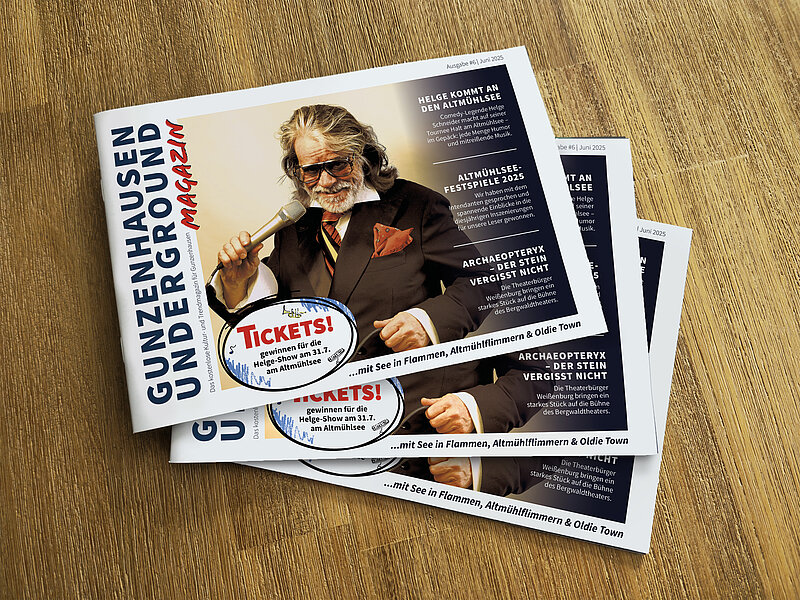 Wir berichten über Kunst, Musik, Literatur, Kultur, Menschen, spannende Projekte und weitere interessante Themen aus und für Gunzenhausen. Das handliche Magazin im Format DIN A5 quer erscheint regelmäßig alle drei Monate. Alle Gunzenhäuser erhalten das Magazin direkt zugestellt. Urlauber finden ihr Exemplare an vielen Verteilerstellen in der ganzen Stadt. Dank der Unterstützung vieler werbetreibender, kulturfördernder Unternehmen und der Stadt Gunzenhausen ist das GUNZENHAUSEN UNDERGROUND Magazin gratis!