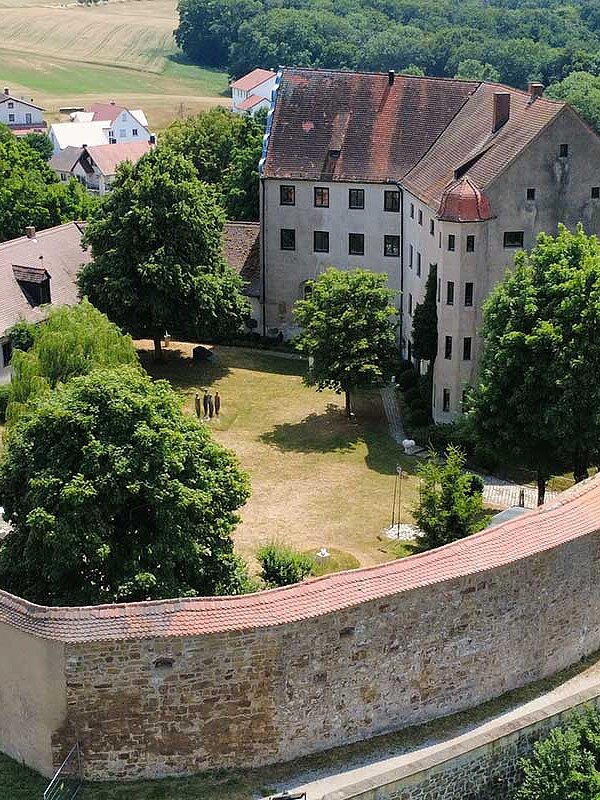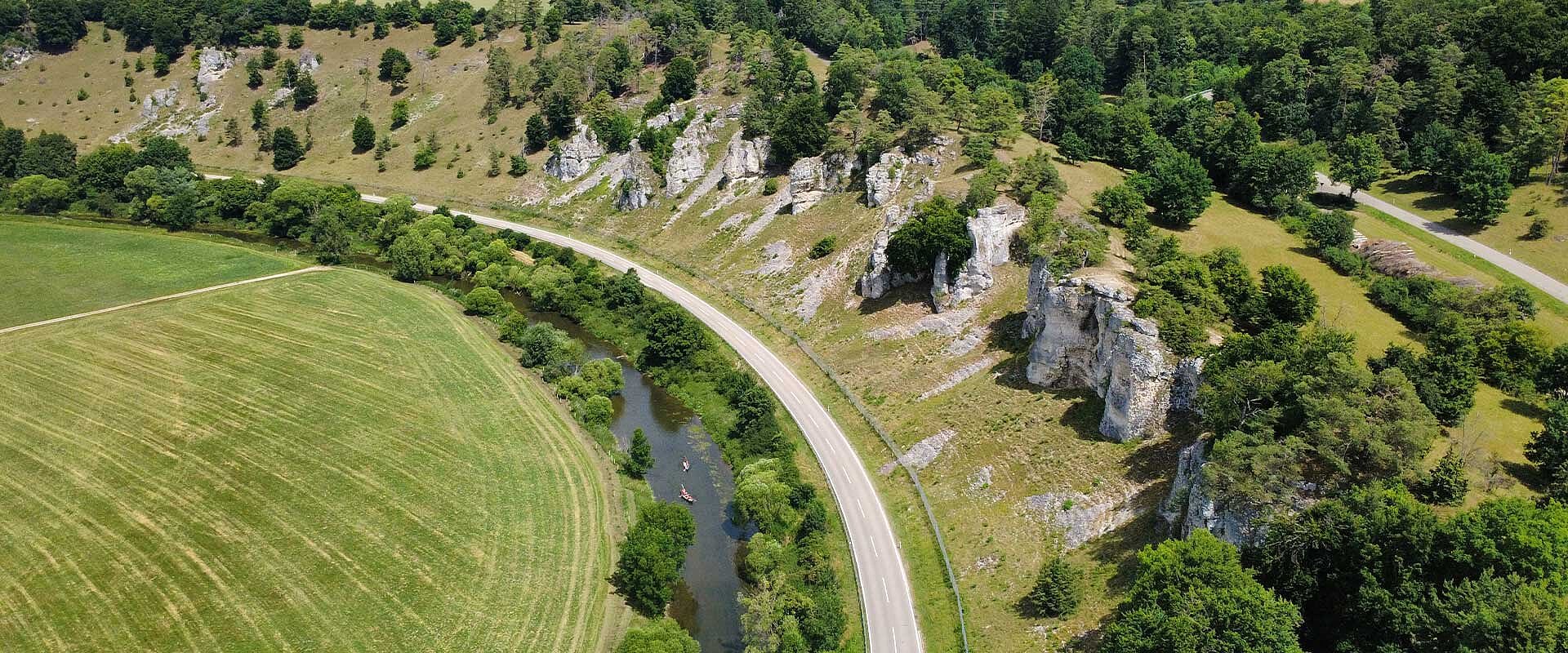 Das Drohnenbild zeigt die neu gestalteten Altmühlauen in Gunzenhausen – ein naturnahes Erholungsgebiet mit Wasserläufen, Wegen und viel Grün mitten in der Stadt.
